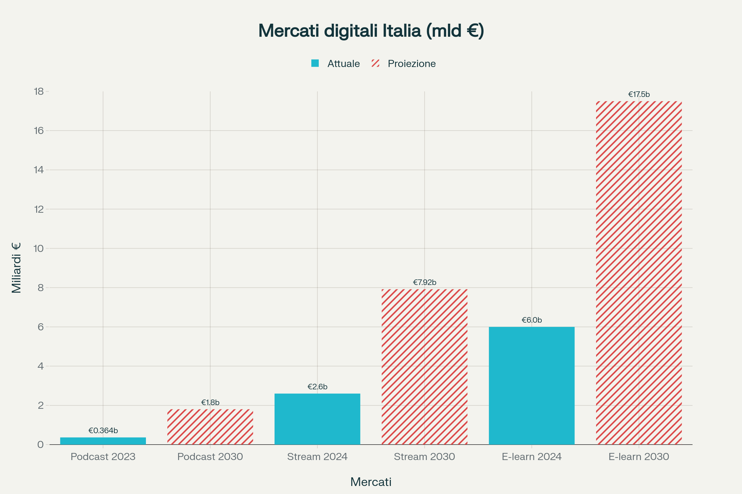 Podcast & Contenuti Audio: Un mercato in crescita esplosiva del 25,6% annuo, che passerà dai €364 milioni del 2023 agli €1,8 miliardi del 2030. L’audio rappresenta la frontiera meno presidiata ma più redditizia del content marketing.